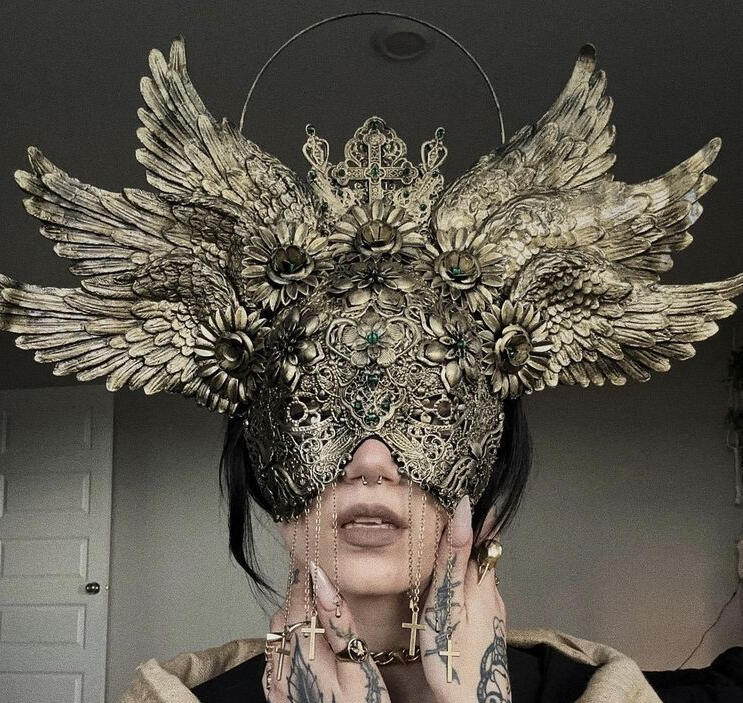 Putting weavers tool and goldsmithing techniques to work Nithe has crafted beautiful masquerade masks that have beautiful woven shapes with fine jewel craft to tie a piece together!